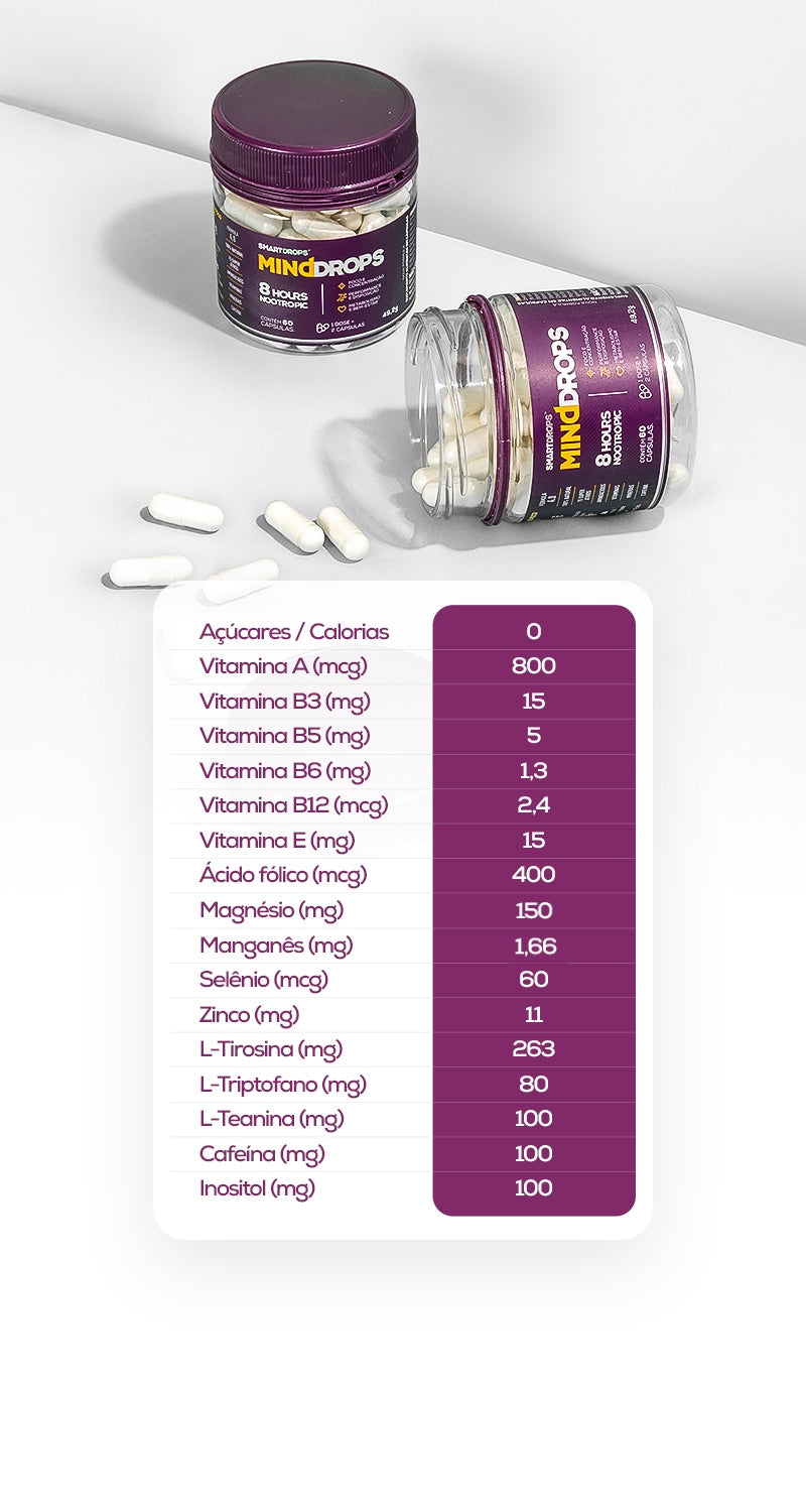 O MindDrops possui uma fórmula completa com ingredientes limpos e naturais perfeita para o uso diário, oferecendo benefícios contínuos, sem causar dependência e potencializando o seu estado de produtividade. Essa é a combinação de ativos que vai te ajudar a atingir o ápice da sua performance cognitiva: Magnésio, zinco, selênio, vitaminas A e E, complexo B, L-Tirosina, Cafeína e L-triptofano