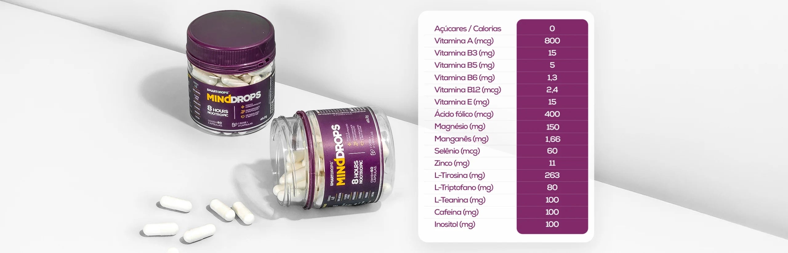 O MindDrops contém a mesma dosagem de cafeína de um café expresso pequeno. Por isso, para garantir que o produto não atrapalhe a sua qualidade de sono, não recomendamos o seu consumo próximo ao horário de dormir.