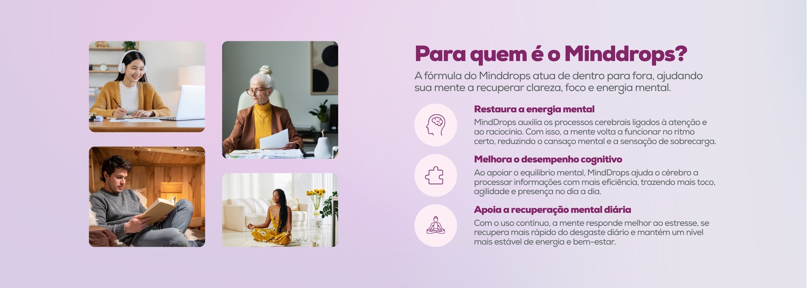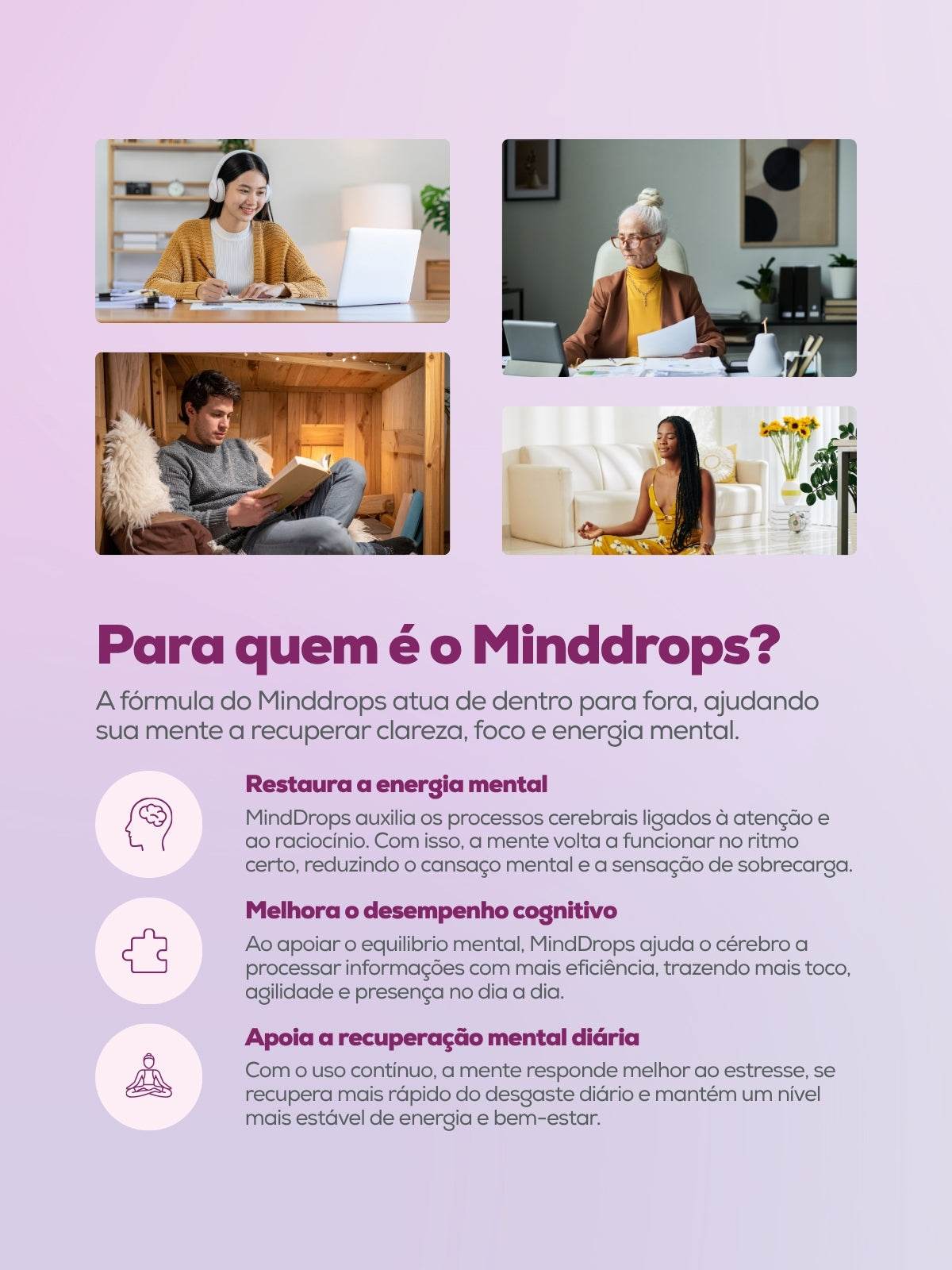 O MindDrops pode ser tomado por profissionais, estudantes, esportistas ou demais adultos ativos que desejam viver uma rotina ainda mais produtiva, criativa e presente.