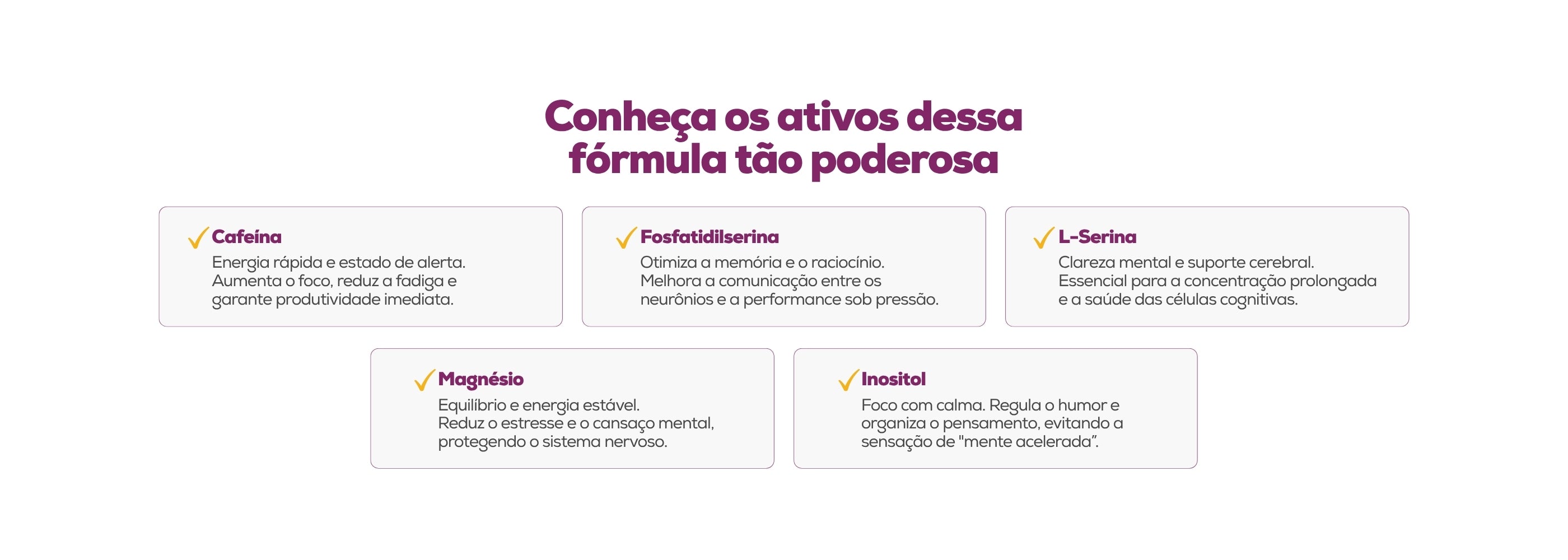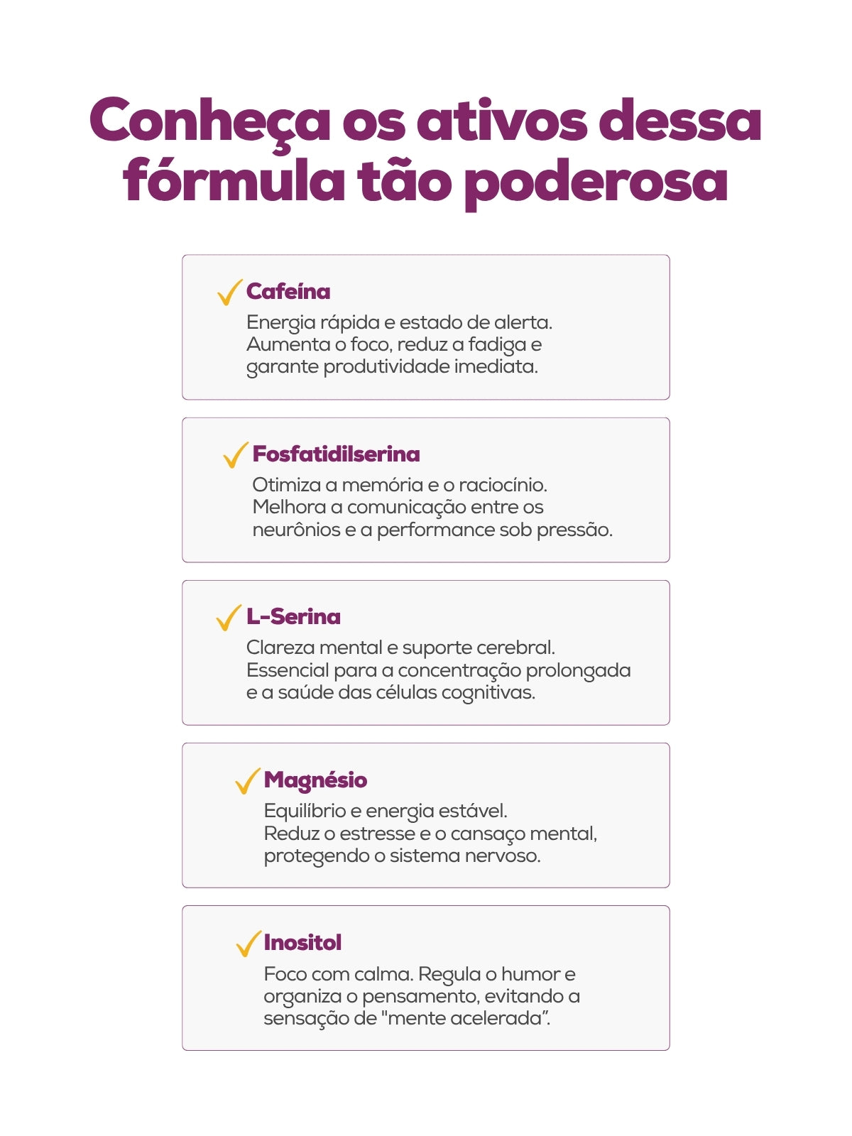O MindDrops possui uma fórmula completa com ingredientes limpos e naturais perfeita para o uso diário, oferecendo benefícios contínuos, sem causar dependência e potencializando o seu estado de produtividade. Essa é a combinação de ativos que vai te ajudar a atingir o ápice da sua performance cognitiva: Magnésio, zinco, selênio, vitaminas A e E, complexo B, L-Tirosina, Cafeína e L-triptofano