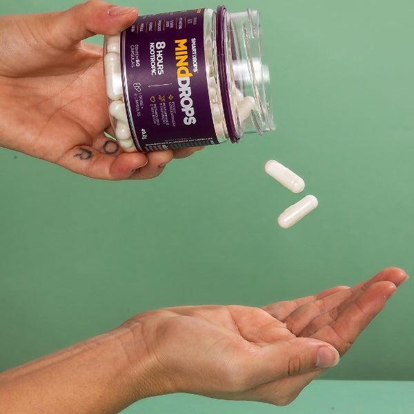 O MindDrops é um suplemento nootrópico natural para foco, concentração e clareza mental, composto por uma fórmula completa de 15 ativos essenciais e biodisponíveis, combinando aminoácidos, minerais, vitaminas e uma dose ideal de cafeína em uma tecnologia exclusiva de liberação progressiva.